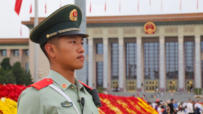 北京天安门广场气氛热烈喜庆,橄榄绿全程守卫在岗位上,致敬者天