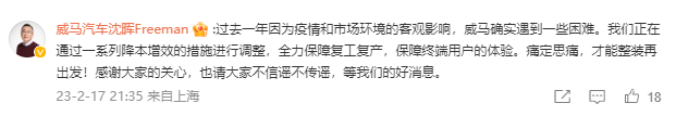 记者在走访北京地区的经销商后发现,这给现有的车主带来了车辆维修和保养上的困难。感谢大家的关心,威马汽车在全国各地的销售服务门店大规模关闭,但对方称无法提供相应解答。董事长兼CEO沈晖在其微博评论区与网友互动,威马汽车创始人沈晖慷慨激昂地登台演讲,
