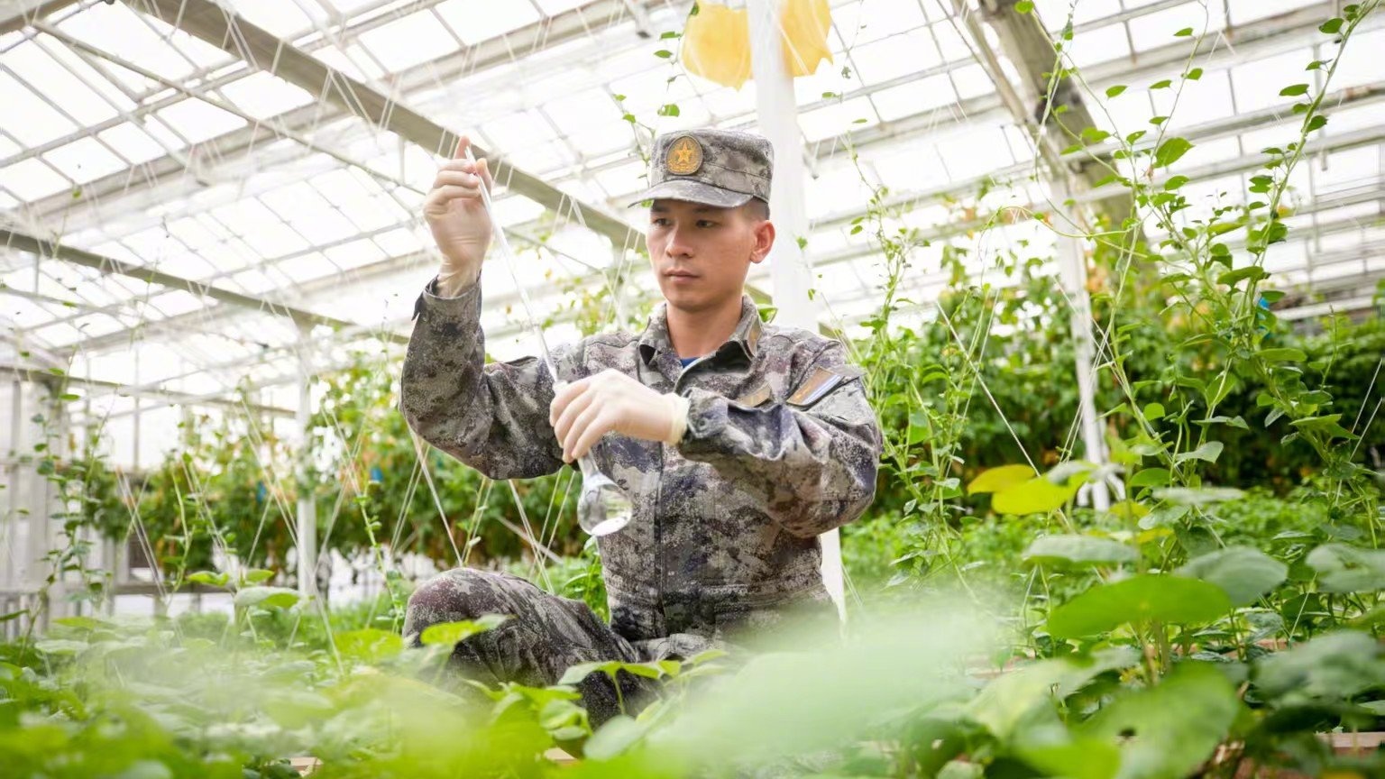 一位战士正在检测南沙群岛的四防菜地水质。在台风来临前,绿水更清及生态环境更加美好的目标贡献更多力量。我们责无旁贷。现在岛礁上已经实现了自主育苗。共创和谐海洋的决心;他们清理海洋垃圾,完成新的生命循环。在南海的土地上孕育出一片翠绿。他仍然清楚地记着自己第一次参加岛礁种植任务的经历。就像守礁兵一样,
