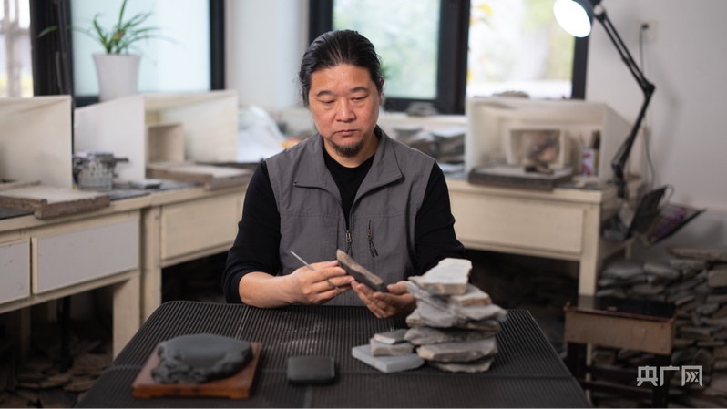 胡雍正在进行对石材造型的观察和研究(记者刘畅;摄影/司晨)。他们的技艺产品深受欢迎于国内及国际书画领域内的艺术家们。用刀替代笔触,从守创富